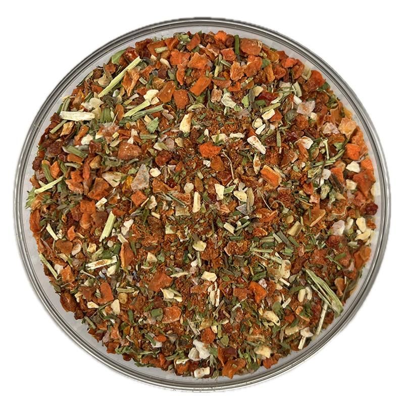 Ingredienser: Morot*, tomat*, vitlök*, lök*, salt (solrosflingor), paprika*, fänkål*, timjan*, basilika*, oregano*, gräslök*, kyndel*, rosmarin*, koriander*, blå bockhornsklöver*