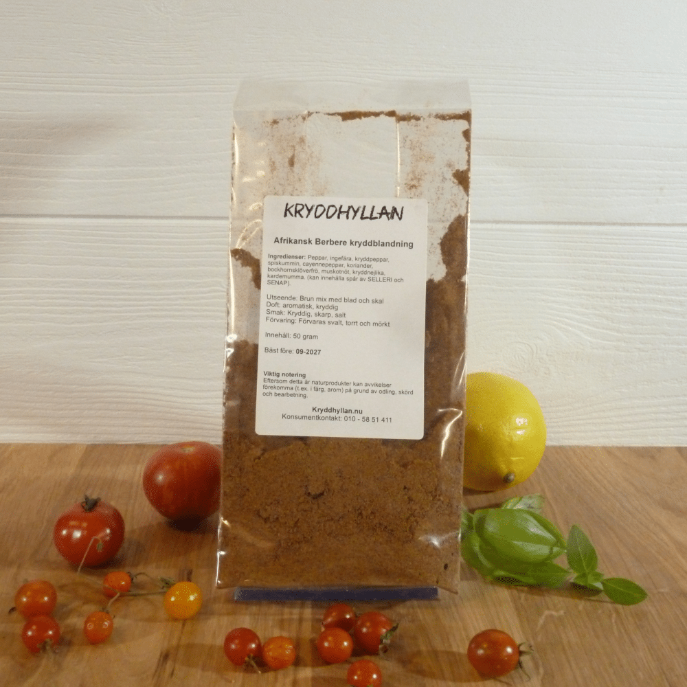 Ingredienser Afrikansk Berbere kryddblandning: Peppar, ingefära, kryddpeppar, spiskummin, cayennepeppar, koriander, bockhornsklöverfrö, muskotnöt, kryddnejlika, kardemumma. (kan innehålla spår av SELLERI och SENAP).