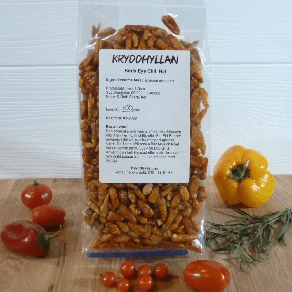 Med 100 000 Scoville-enheter är Birds eye chili hel bland världens hetaste chili. Deras skärpa är intensiv och direkt. Deras smak liknar den hos thailändsk chili, så de lämpar sig mycket bra till varma asiatiska rätter, men även till att vässa soppor och såser, grytor, grytor och varma BBQ-såser.
