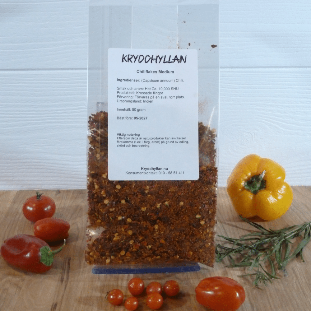 Våra Chiliflakes Medium är en chili som har lite minfre hetta, men samma goda smak som vanlig chili, vi har valt att ta in denna sort så även de som inte gillar det väldigt starka kan njuta en god hemlagad chili con carne eller liknande rätter.