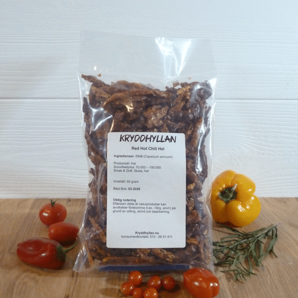 Red Hot Chili Hel innehåller 100% torkad röd chili (utan stjälkar) från Thailand.