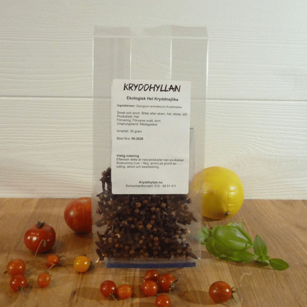 Ekologisk Hel Kryddnejlika är en mycket stark aromatisk krydda, en av de äldsta och mest populära runt om i världen. Kryddnejlika soltorkas i det fria i tre till fyra dagar och kan användas som hel eller malet. Hela våra kryddnejlika är 100% GMO-fria och odlas på Madagaskar och Sri Lanka.