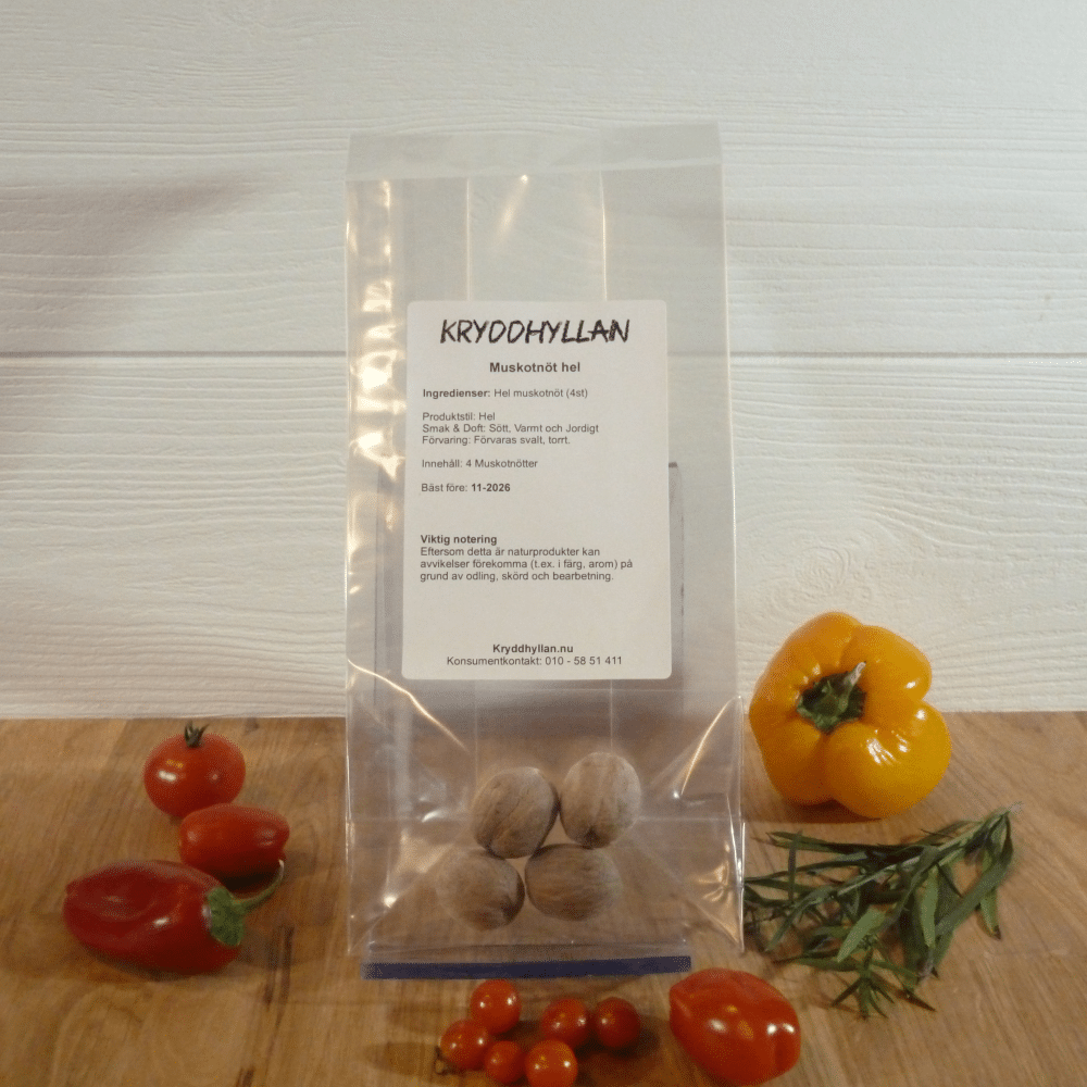 Hel muskotnöt är den kvarvarande kärnan i fröet från trädet som producerar en frukt som liknar en persika som inte är ätbar. Inuti fruktköttet sitter en grop omslagen av ett yttre brunt skal. När skalet är spräckt hittar du muskotnöten. Vår Hela muskotnöt odlas i Indonesien. Eftersom hel muskotnöt rivs efter behov är detta den bästa formen för att säkerställa maximal färsk smak.
