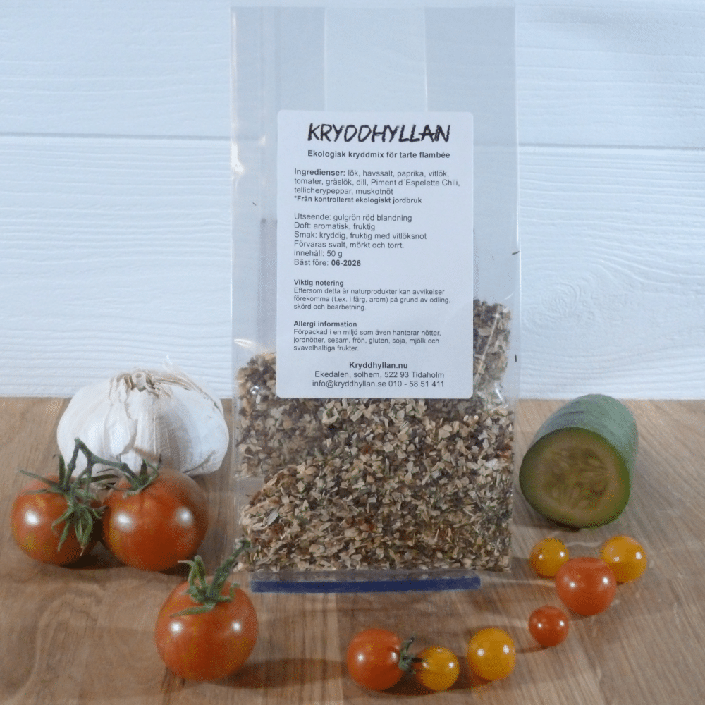 Ekologisk kryddmix för tarte flambée är en läcker kryddblandning från naturligt havssalt och de bästa kryddorna från kontrollerad ekologisk odling som man sprider ut på det lager av creme fraiche som grunda tarte Flambéen.