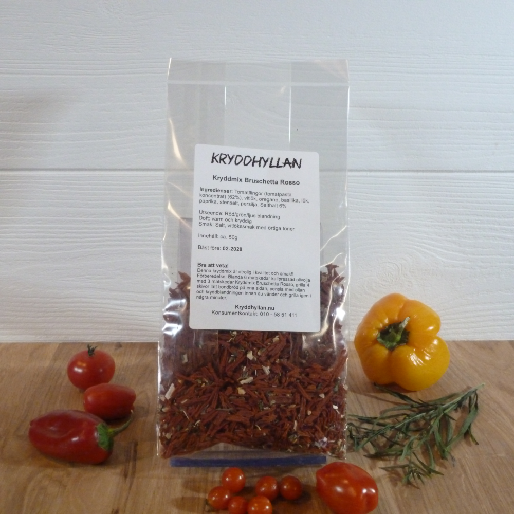 Denna kryddmix är otrolig i kvalitet och smak!! Förberedelse: Blanda 6 matskedar kallpressad olivolja med 3 matskedar Kryddmix Bruschetta Rosso, grilla 4 skivor lätt bondbröd på ena sidan, pensla med oljan och kryddblandningen innan du vänder och grilla igen i några minuter.