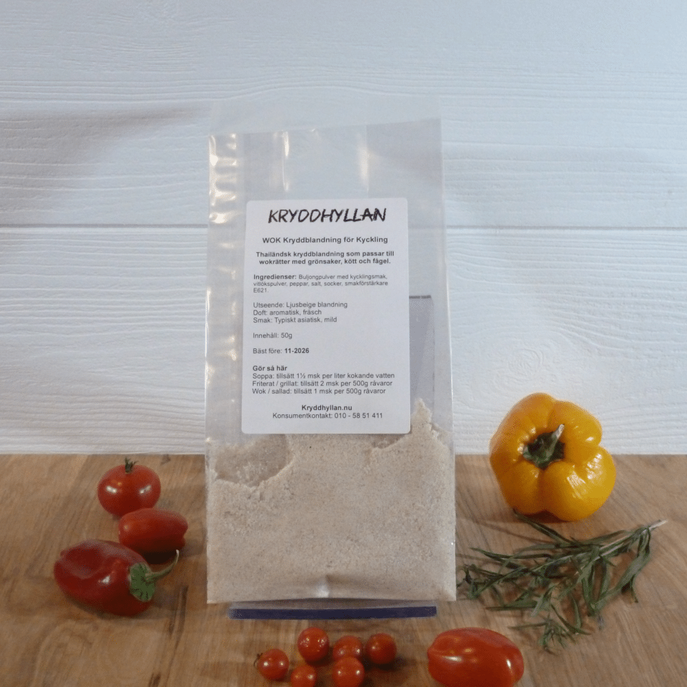 Ingredienser WOK kryddblandning: Buljongpulver med kycklingsmak, vitlökspulver, peppar, salt, socker, smakförstärkare E621.