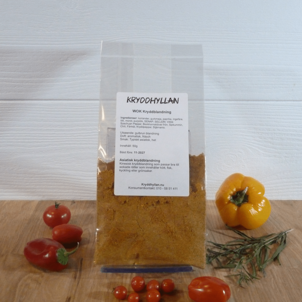 Ingredienser WOK kryddblandning: koriander, gurkmeja, paprika, ingefära, lök, morot, purjolök, SENAP; SELLERI; Vitlök Szechuan Peppar, Bockhornsklöver frön, Spikummin, Chili, Fänkål, Kryddpeppar, Stjärnanis.