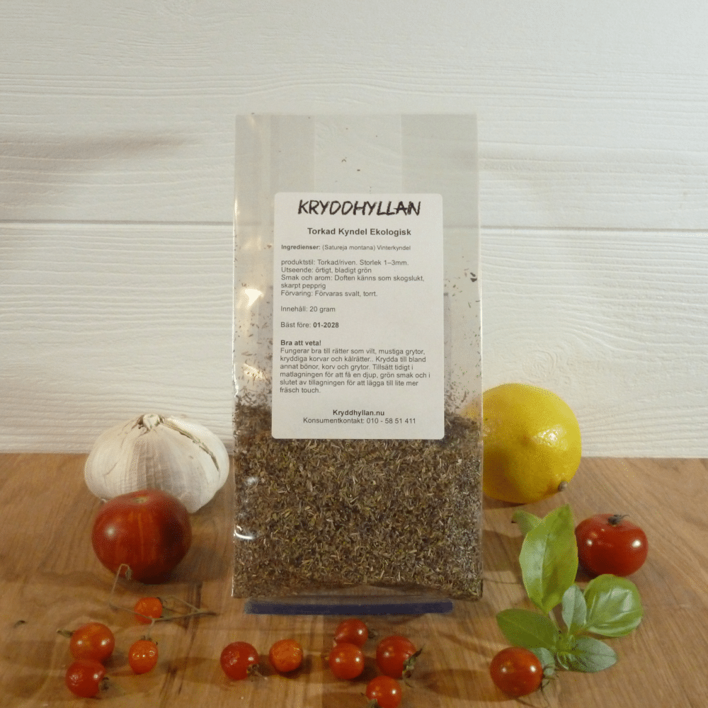 Torkad Ekologisk Kyndel är en ört som har lite pepprig smak och klarar sig bra i klassiska brittiska och tyska livsmedel. Breda bönor, polbönor, kanin, fet fisk, kål och potatis älskar alla att vara ihop med kyndel.